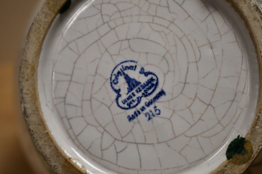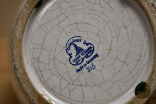 A mid 20th-century German Ulmer Keramik pottery ewer, of bulbous form, with a handle and flared rim, featuring hand-painted floral motifs and a green crosshatch pattern, marked to base, 26cm, condition is consistent with age and use, some small chips to base rim.