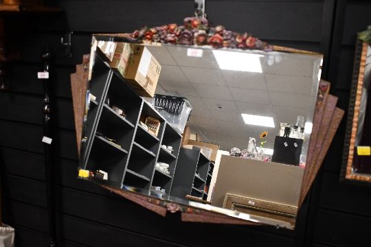 A large early 20th-century Art Deco Barbola-style wall mirror, featuring intricate, hand painted plaster flowers and foliage with fan-formed panels with gilt detailing, unmarked but hanging fixtures to reverse, approximately 73cm x 54cm, condition is consistent with age and use, having visible areas of surface wear and small areas of cracking to finial, sold as seen.