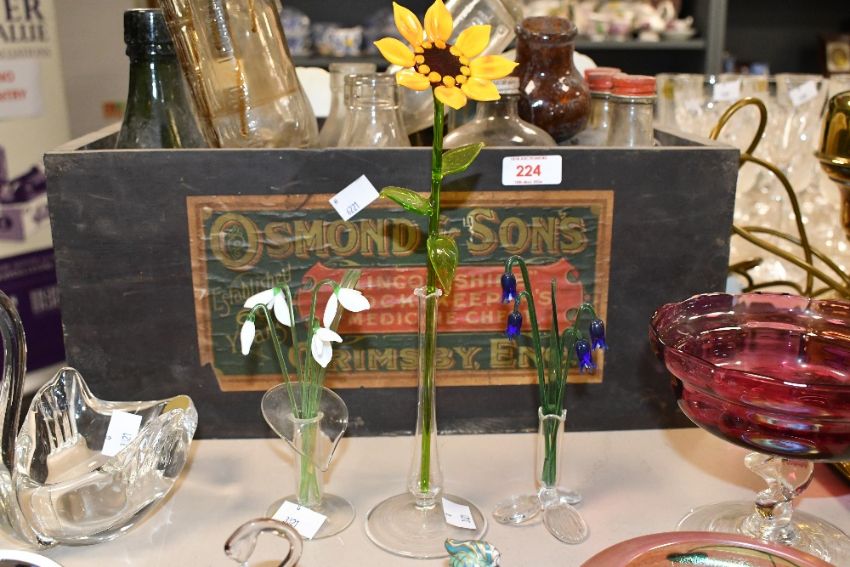 A selection of 20th-century decorative sundry art glass, to feature a quantity of delicate flower-formed ornaments such as bluebells, a sunflower and snowdrops; a large Langham glass swan; a Swarovski Crystal swan; a Heron Glass-style iridescent swan; a J. Ditchfield for Glasform lustre bowl; a Selkirk paperweight; a Caithness 'Jester' paperweight and more, some marked but not all, (12), condition is consistent with age and use, having visible areas of wear to some, no visible chips, cracks or fixed damage, all sold as seen.