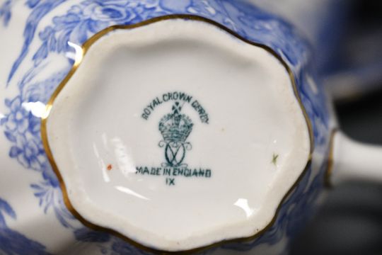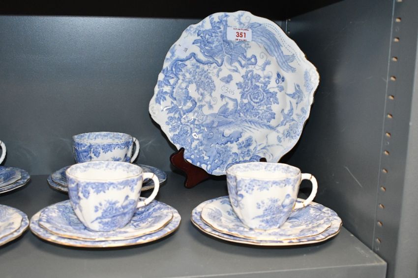 A fine selection of 20th-century Royal Crown Derby bone china 'Aves Blue' part tea set, featuring intricate blue and white foliate and floral detailing adorned with peacocks and bird motifs, with softly scalloped gilded rims, to include cups, saucers, small serving tray, side plates, sugar bowl and milk creamer, all marked to base, condition is consistent with age and use, having been cabinet kept and well preserved by repute, having no visible chips, cracks or fixed damage, some small areas of surface wear, all sold as seen.
