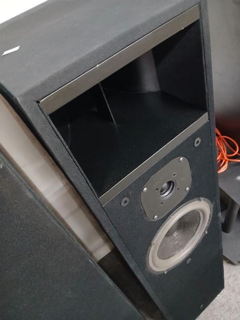 A pair of Impulse H2 Stereo Loudspeakers with 3-Way Horns - new tweeters and mids - bass re-foamed 2024 , antique gold wrap on top of original rosewood cheeks - come with a set of spikes , nice working condition and highly sought after - please come in and view - amazing speakers and the first time we have had a pair in