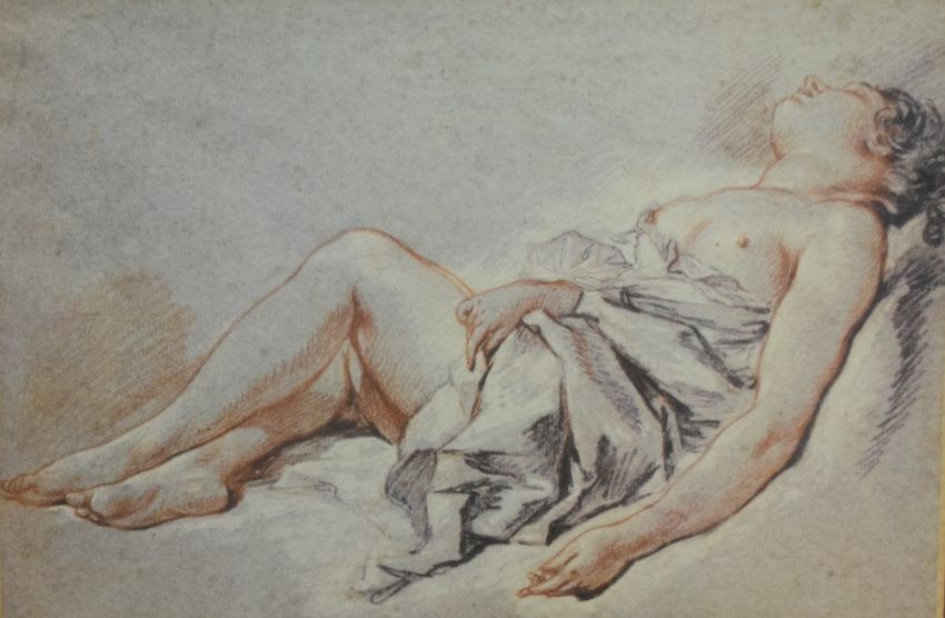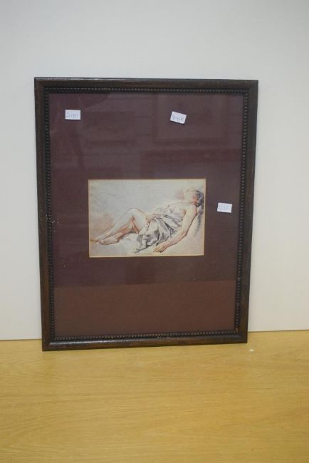 After Francois Boucher (French 1703 - 1770) Lithograph 'A Sleeping Girl', a female life study, within red card mount and moulded wooden frame, under glass 21cm x 13.5cm & 49cm x 39cm overall.
