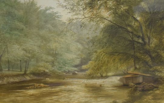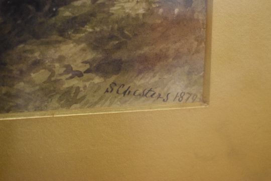 S Chesters (19th Century) Watercolour, a woodland river scene, signed and dated (1870) lower right, within gilt slip and moulded gilt frame, under glass 44cm x 27.5cm & 66cm x 50cm overall.