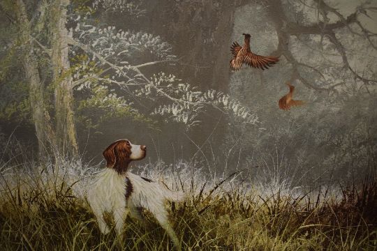Leiford (British 20th Century) oil on canvas, a woodland hunting scene depicting spaniel and game birds, signed lower right, within moulded gilt frame, 90cm x 59.5cm & 104cm x 73cm overall.