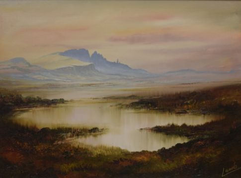 Leslie Lamb (Scottish 20th Century) Oil on canvas 'The Old Man of Storr, Isle of Skye', a mountainous coastal landscape at sunset, signed lower right, entitled and attributed verso, within canvas slip and moulded gilt frame, 39cm x 29.5cm & 54.5cm x 44.5cm overall.