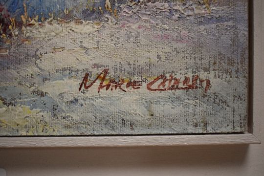 Marie Charlot (20th Century) Impressionistic oil on canvas, depicting 19th Century women on a beach, signed lower right, within white wooden tray frame, 25cm x 19.5cm & 35.5cm x 30.5cm overall.