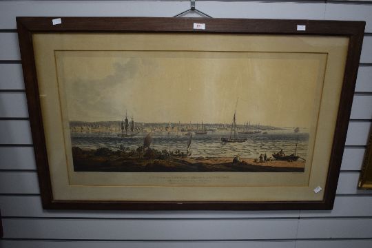 After H.E James and W.J Bennett (19th Century) Hand colourised etching 'A View of the Town and Harbour of Liverpool', entitled and attributed to lower margin, within card mount and moulded wooden frame, under glass 87cm x 49cm & 109cm x 69.5cm overall.