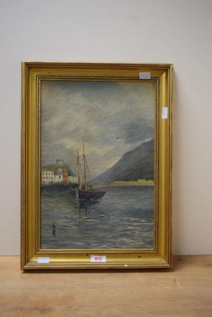 Chas Chambers (19th/20th Century) oil on canvas, depicting moored fishing boats in a harbour, unsigned, attributed verso, within moulded gilt frame, 27cm x 39cm & 36cm x 49cm overall.