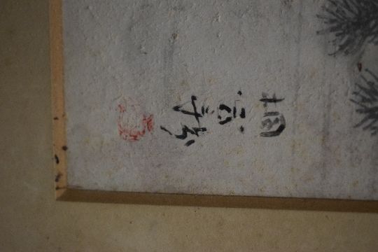 A pair of 20th Century Chinese scroll inspired watercolours, woodland scenes with women in traditional clothing seated, within card mounts gilt slips and moulded white frames, under glass 18cm x 94cm & 49cm x 125.5cm overall.