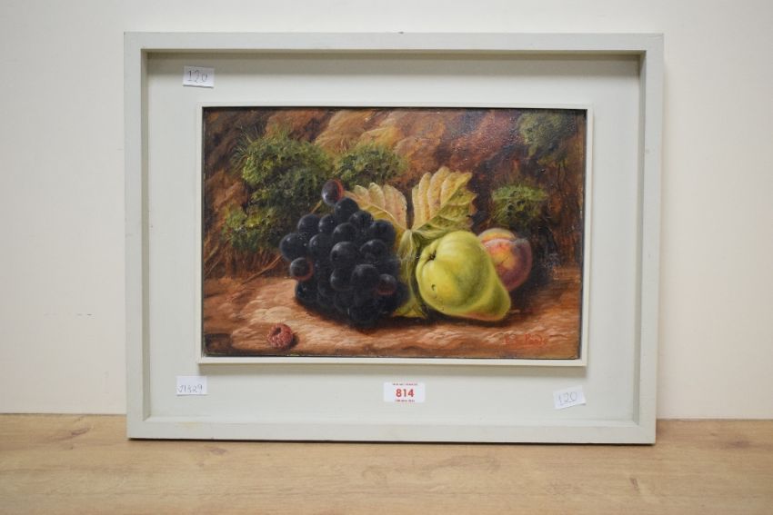 E.L Poole (British 20th Century) oil on board, an outdoor still life study with moss and autumn leaves amongst fruit, within white wooden tray frame, 21cm x 32cm & 34cm x 44.5cm overall.