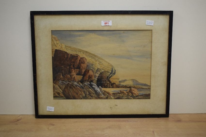 A 19th/20th Century watercolour, coastal study with beach cliff and rock face, unsigned or attributed, within card mount and thin black frame, under glass 34.5cm x 24cm & 48.5cm x 38cm overall.