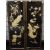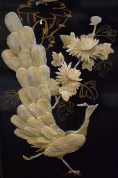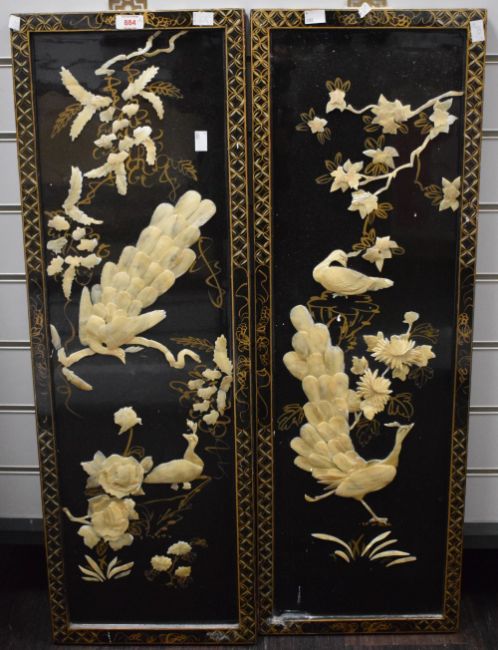 A pair of 20th Century Chinese lacquered panels with mother of pearl and guilding, depicting peacocks and foliage, 30cm x 91cm overall.