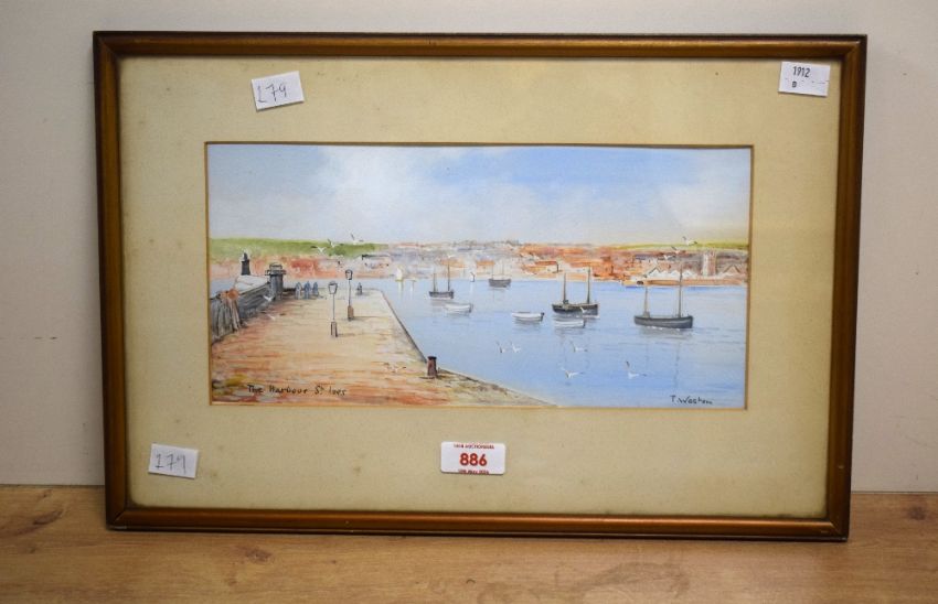 T Weston (British 20th Century) Watercolour 'The Harbour St Ives', an idyllic Cornish coastal scene, signed lower right and entitled to left, within card mount and moulded gilt frame, under glass 29cm x 14cm overall.
