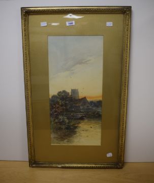 W Foxgile? (British 19th Century) Watercolour, a riverside church with boat and figures, signed lower left, within gilt mount and moulded gilt frame, under glass 24cm x 51cm & 47cm x 76cm overall.
