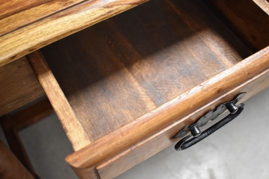 A modern hardwood side table having two frieze drawers and turned frame, dimensions approx. Width 133cm, depth 60cm, height 76cm