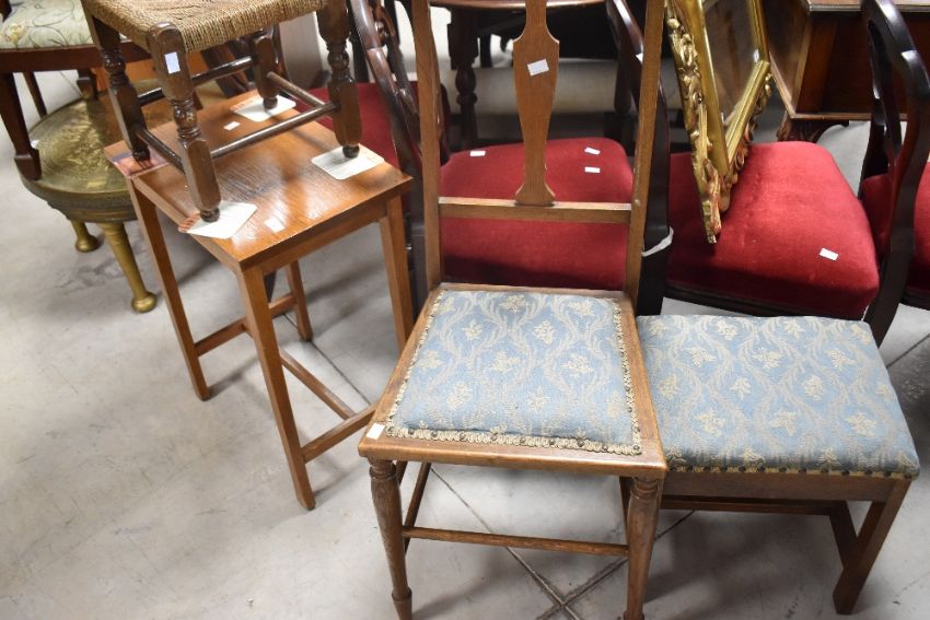 Four pieces comprising early 20th Century bedroom chair , footstool with similar upholstery, oak side/table in the arts and crafts style and a strung footstool