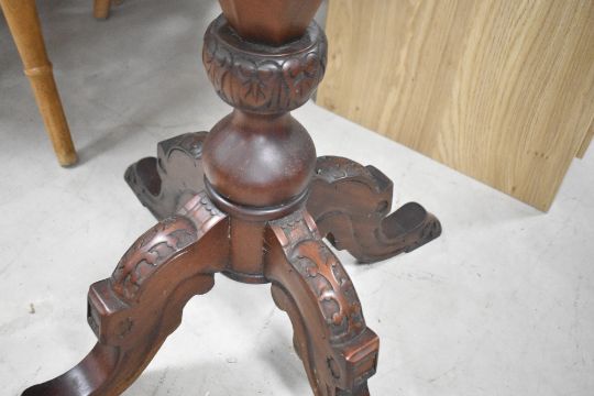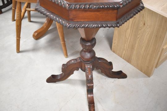 A reproduction hardwood sewing table having octagonal top, approx. diameter 50cm