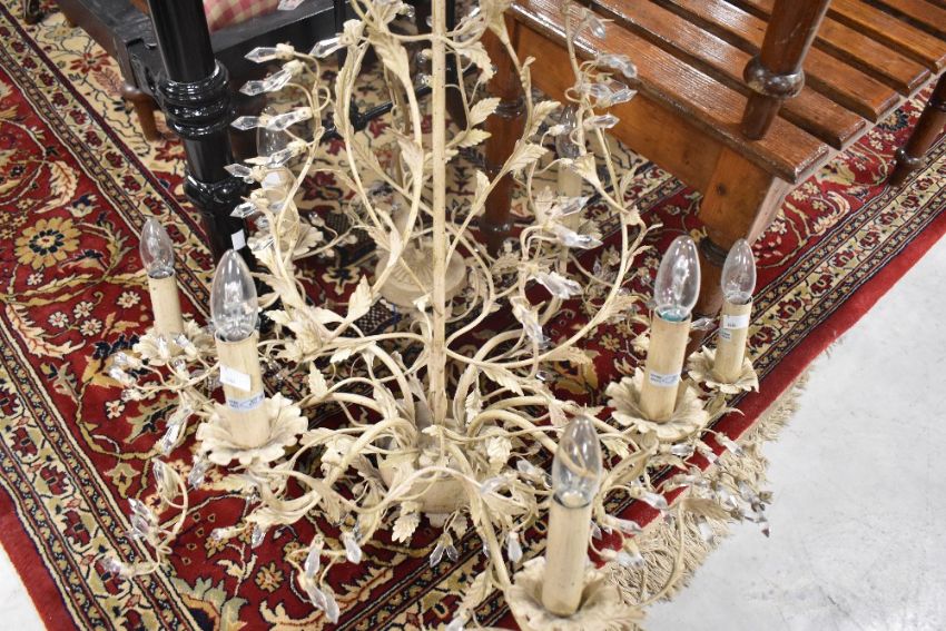 A modern ceiling light fitting, chandelier, with faux candles and foliate design