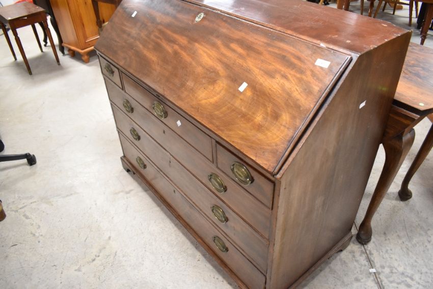 A 19th Century mahogany bureau having fitted interior including later green felt , drawers fitted with Regency style brass handles, dimensions approx. width 117 height 101 depth 55cm