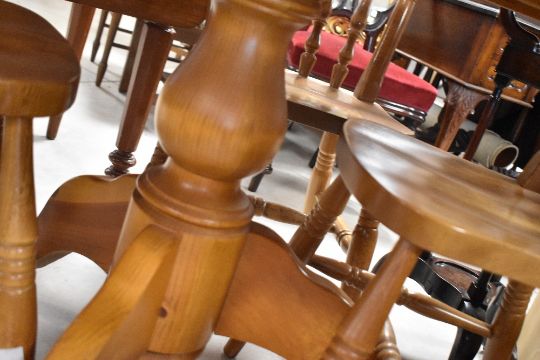 A modern pine kitchen dining table of circular form and a set of four complimentary rubber wood dining chairs, table diameter approx. 105cm