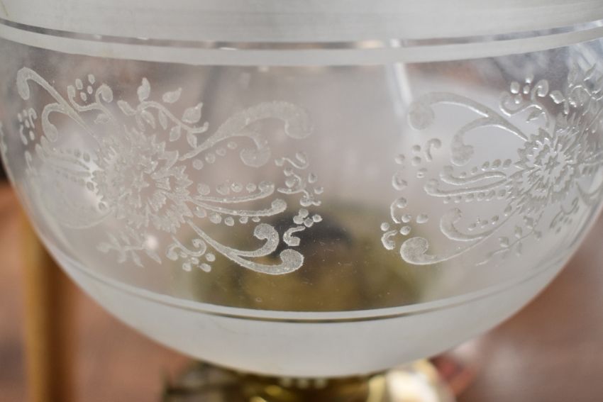 A traditional oil lamp having smoke glass chimney spherical part etched shade