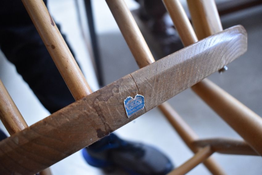 A set of three Ercol hoop and stick back kitchen/dining chairs having H stretcher supports and splay legs