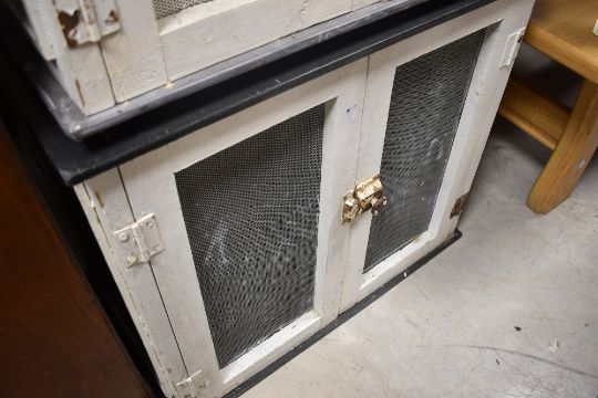 Two traditional meat safes of typical design but having desirable polished North Wales slate tops and bases, each dimensions approx. Width 64 depth 35 height 55cm