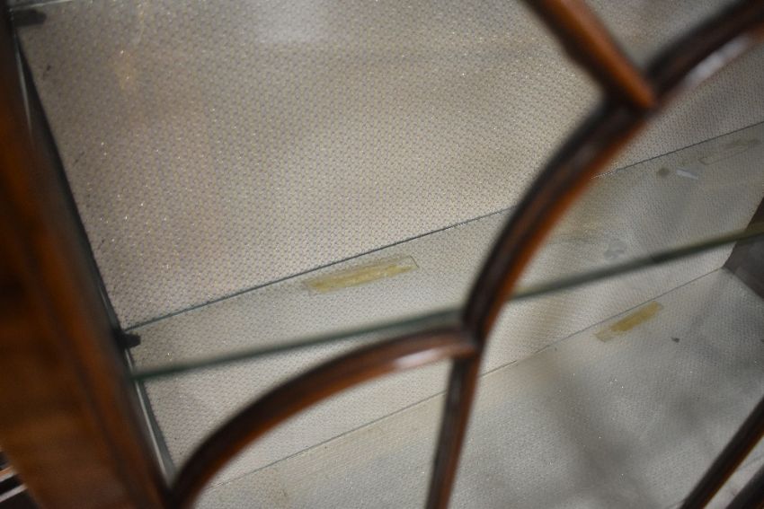 An early 20th Century walnut china cabinet, having glass shelves , on short cabriole legs, dimensions approx. Width 106 height 119cm