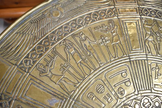An Edwardian mahogany oval back bedroom chair and Egyptian themed brass topped coffee table