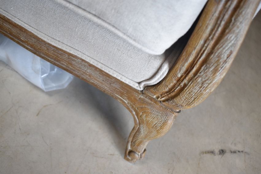 A vintage settee in the French style having limed effect frame and neutral upholstery, width approx. 153cm