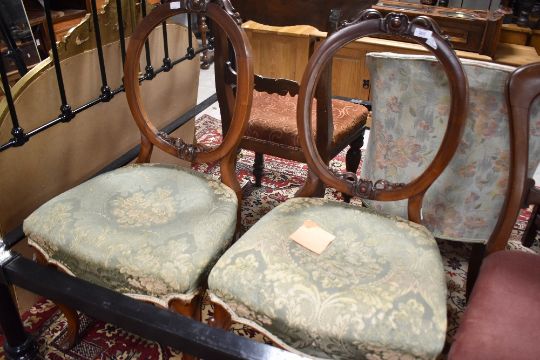 A pair of Victorian mahogany balloon back salon chairs having overstuffed seats and shaped legs
