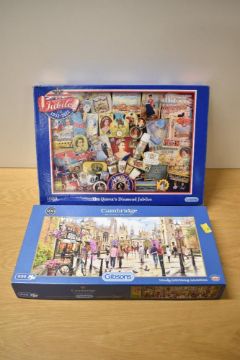 This collection consists of approximately 11 boxed jigsaw puzzles, primarily manufactured by the British company Gibsons. The puzzles are made from printed cardboard and are housed in their original illustrated cardboard boxes. The titles by Gibsons include Highclere Castle (500 pieces), Furry Friends by Steve Crisp (1000 pieces), Blackpool Promenade by Derek Roberts (500 pieces), Upstairs and Downstairs by Val Goldfinch (500 pieces), A Spiffing Time by Fortunino Matania (500 pieces), and a commemorative The Queen's Diamond Jubilee collage (1000 pieces). Panoramic format puzzles include Cambridge by Richard Macneil (636 pieces) and Landing the Catch (636 pieces). The lot also contains Cotswold Villages by Terry Harrison (2 x 500 pieces). Other manufacturers represented are F.X. Schmid with Dear Faces (1000 pieces) and W.H. Smith with puzzle No. 4 (1000 pieces). Additionally, the lot includes a vintage wooden game or puzzle box and a selection of plush toys and dolls in plastic bags situated on the lower shelf.