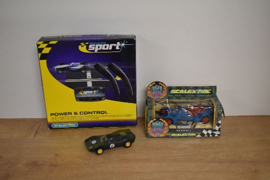 A collection of Scalextric slot racing items and accessories, manufactured by Hornby Hobbies Ltd. The lot features a boxed Scalextric Sport Power & Control accessory set, which includes a power base and two hand controllers. Also present is a boxed Scalextric The Power and the Glory Vanwall racing car, finished in blue with an integrated driver figure. An unboxed black racing car with yellow wheels and number 6 decals is included. The remainder of the lot consists of miscellaneous components housed in secondary storage boxes, including power transformers, hand controllers, and various track parts. The items are primarily constructed from plastic with metal and electronic components.