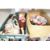 A collection of vintage dolls and toys presented in a green plastic crate and a wicker basket. The lot features a mid-20th-century doll constructed from vinyl or hard plastic, featuring rooted blonde curly hair, blue sleep eyes with lashes, and an open mouth with visible teeth. This doll is dressed in a red and white gingham shirt with a white lace collar, a maroon corduroy pinafore skirt, and red plastic shoes. The green crate also contains a doll wearing a green felt-style hat and cream coat, a dark-skinned fabric doll with a green ribbon sash, and smaller figures in lace and tartan clothing. The wicker basket contains various smaller baby dolls, including one in a blue floral-patterned dress, a doll in a white and red knit outfit, and a dark-skinned doll head. A separate grey crate below contains an assortment of small toy vehicles and parts. No maker's marks or factory stamps are visible on the items. Main doll height: approximately 45cm - 50cm.