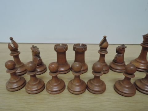 Staunton Pattern Boxwood and Ebony Chess Set in the Staunton pattern, King height 7.5cm, crack to base of ebony queen, ebony knights different heights, damage to one ebony pawn, normal wear and tear, no other major faults