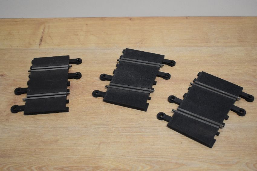 A large group of vintage 1:32 scale slot car track sections, attributed to the Scalextric Classic track system. The collection includes an assortment of components such as long straight sections, short straights, and curved pieces. The sections are manufactured from black textured plastic with twin metal rails and feature the spoon-style connector mechanism. The lot is housed in two non-original cardboard storage boxes.