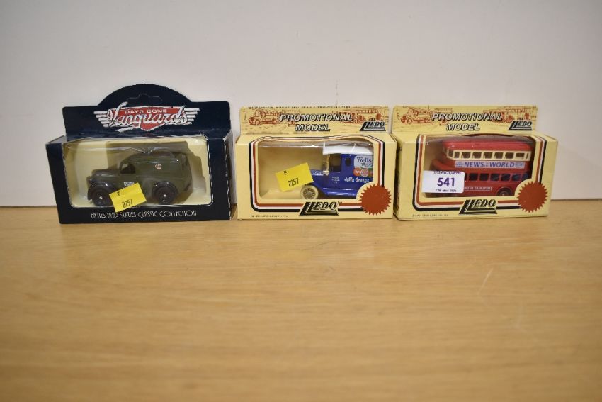 A collection of model vehicles primarily manufactured by Lledo and Matchbox. The Lledo examples comprise various series including Days Gone, Promotional Models, and Vanguards from the Fifties and Sixties Classic Collection. Matchbox models are represented by the Models of Yesteryear range. The vehicles feature die-cast metal bodies with plastic components and are designed with free-wheeling movement. The lot includes a wide variety of vintage commercial and promotional liveries, such as News of the World, Penguin Books, Bird's Custard, Wells and Co Ltd Jaffa Orange Drink, Post Office Telephones, Be-Ro, and Sharp's Toffee. Specific commemorative models include an EastEnders promotional bus, a National Garden Festival 1986 souvenir bus, and a Northampton Corporation 800 Years bus. Most items are presented in their original window display boxes. Printed marks present on the packaging include LLEDO, DAYS GONE, Vanguards, and MODELS OF YESTERYEAR. The items feature temporary auction lot labels marked 541 and F 2257.