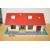 A mid-20th century dolls house in the form of a bungalow, possibly by Tri-ang. The model is of painted wooden construction, featuring a red gabled roof with two sets of twin chimneys. The exterior is finished in white with yellow horizontal banding and a red ribbed garage door to the right side. A raised yellow step provides access to the central recessed entrance. The front corners of the building are decorated with simple hand-painted green and red floral vine motifs. The entire structure is mounted on a larger wooden base board, which is painted with a grey and white crazy paving pattern for the driveway and green borders representing grass. A small rectangular red wooden plaque is affixed to the front edge of the base, bearing the name OUR HOUSE in white and black lettering. The back of the house is open to reveal a partitioned interior. Included with the house is a collection of miniature items contained within a white plastic storage tub with a handwritten label reading DOLL HOUSE FURNITURE.