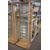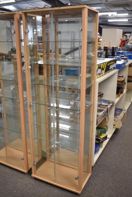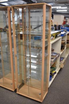 A pair of tall, upright display cabinets featuring light wood-effect frames. Each unit is constructed with glass side panels and twin front-opening glass doors. The doors are fitted with central circular metal locks. The interiors contain multiple adjustable glass shelves. Both cabinets are equipped with internal puck-style lighting units at the top, with loose white electrical wiring visible within the interior. Small white adhesive auction lot labels, including one marked 579, are attached to the glass panels. The design is consistent with retail display units such as those produced for the Argos Home range.