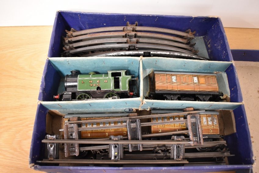 A vintage Hornby O gauge clockwork train set manufactured by Meccano Ltd, Liverpool. The set is constructed from lithographed tinplate and comprises an 0-4-0 tank locomotive in London and North Eastern Railway (LNER) green livery, numbered 460 with LNER lettering on the side tanks. Included are two four-wheel passenger coaches finished in a brown teak-effect LNER livery, both marked as third-class carriages. The set comes with a collection of curved and straight tinplate track sections. The items are housed in their original blue cardboard presentation box, featuring a pictorial lid with the Hornby Train logo and internal dividers. The box lid is printed with Made in England by Meccano Ltd, Liverpool. The locomotive features a clockwork mechanism with a winding aperture to the side of the body.