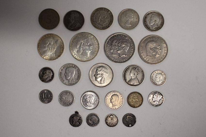 World Silver Coinage, Comprising, An Austria 25 Schilling, Belgium, Canada, Denmark, France, Greece, An India 1862 Half Rupee, Iran, Malta, Netherlands Juliana 1964 Two and A Half Gulden, Portugal, South Africa, Sweden, USA Mercury And Roosevelt Dimes, A Small Saint Benedict Medal. Total Weight Of Silver Approx 62 Grams