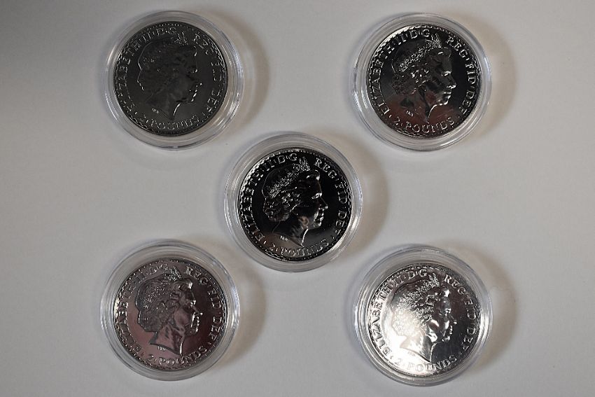 Royal Mint Elizabeth II, 2014, Silver Britannia Two Pounds, BU, Obv Elizabeth II, Rev Britannia 1oz 999 Fine Silver, 31.21 Grams, Encapsulated. (5). Total Weight Of Silver Approx 156 Grams