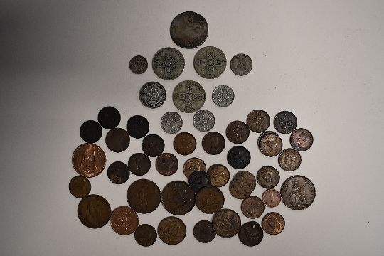 A William III Half Crown (Very Worn), Also A Collection Of 19th And 20th Century Silver And Copper Coinage Comprising, George V Florins 1921 x2, 1922, A George VI 1946 Shilling, A George V 1924 Sixpence, Elizabeth II Sixpences x3, A George VI 1934 Threepence, George V, George VI, Elizabeth II Pennies, An Irish 1928 Penny, George VI And Elizabeth II Halfpennies. Farthings 1840, 1862, 1865, 1866 x2, 1886, 1904, 1908, 1910, 1917, 1925, 1930, 1931, 1939, 1940 x3, 1942, 1943 x2, 1945 x2, 1946, 1947, 1948, 1950, 1952, 1953, 1954. A Decimal 2p, A German 1 Pfennig. Approx Weight Of Silver 26 Grams