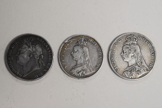 Nineteenth Century Silver Coinage, Comprising, A George IV 1821 Crown Secundo, A Queen Victoria 1889 Jubilee Head Crown, A Queen Victoria 1890 Double Florin, (3) Total Weight Of Silver Approx 71 Grams.