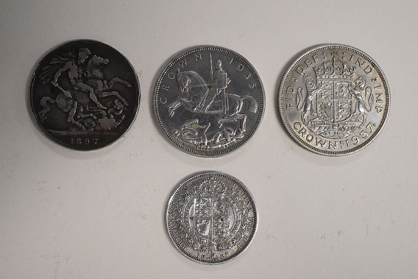 A Queen Victoria Silver Crown 1897 LXI, Old Veiled Bust, A George V 1935 Rocking Horse Crown, A George VI 1937 Coronation Crown. A Queen Victoria 1887 Victoria 1887 Jubilee Head Half Crown, Rev Crowned Shield In Garter, (4) Total Weight Of Silver Approx 66 Grams