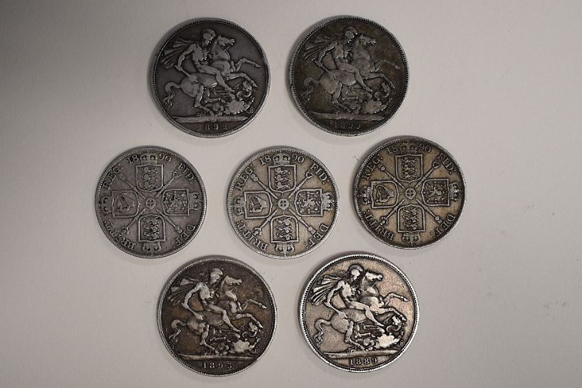 A Collection Of Queen Victoria Silver Crowns And Double Florins, Comprising, Crowns, Jubilee Head, 1889, 1892, Old Veiled Head 1893, 1899 Double Florins 1890 x3, (7) Total Weight Of Silver Approx 165 Grams