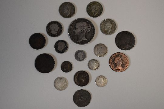 Nineteenth Century Silver Coinage And Eighteenth And Nineteenth Century Copper Coinage, Including A Queen Victoria 1845 Crown Young Head, A George III 1817 Shilling, George IV Shillings 1825, 1826 x2, A Queen Victoria 1842 Fourpence, And 1885 Threepence. Some Worn Silver Sixpences And Threepences. Copper Halfpennies, George I 1719, George II 1734, George III 1772, (All Worn), Farthings, George III, 1799, Queen Victoria 1845. A Hammered Jetton. Total Weight Of Silver Approx 57 Grams.