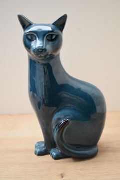 A 20th century Poole pottery blue glazed Siamese cat study, marking to base, measures 29cm tall.
