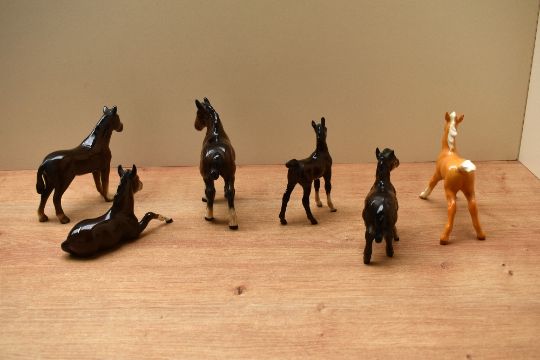 A group of six Beswick Pottery foal studies to include 'Foal' (Lying) model number 915 and 'Shetland Foal' model number 1034 both designed by Arthur Gredington in brown gloss finish.