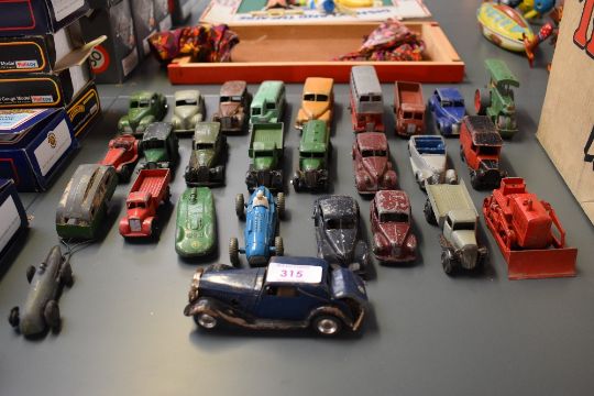 Twenty six pre and post war playworn Dinky diecast vehicles including Studebaker, Lincoln Zephyr, Oldsmobile, Record Car, Open Wagons, Tankers Estate Cars etc along with a Tri-ang Minic clockwork Vauxhall Cabriole 19M in blue